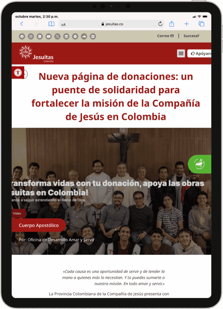 La Provincia Colombiana de la Compañía de Jesús presenta con alegría el lanzamiento de su nueva página web de donaciones: una plataforma pensada para que cualquier persona pueda apoyar, de manera sencilla, segura y transparente, las obras apostólicas que los jesuitas y sus colaboradores impulsan en todo Colombia.