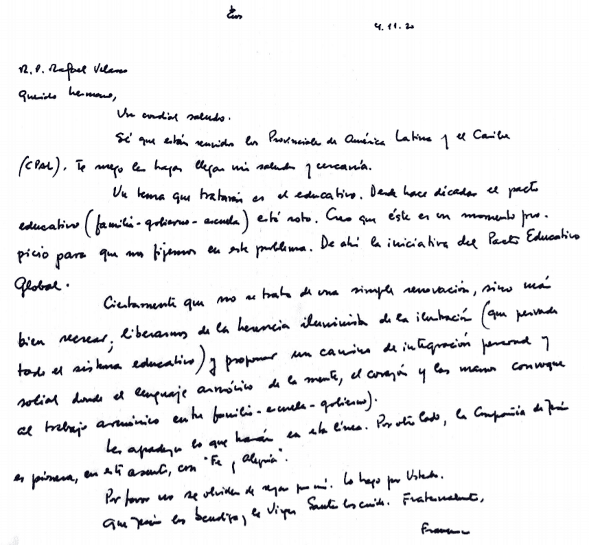 En relación con nuestra misión de acompañar a los jóvenes en la creación de un futuro esperanzador, el P. General resaltó la importancia del Derecho Universal a Educación de Calidad (DUEC). El Papa Francisco, enterado de que este era uno de lo temas importantes de nuestra Asamblea nos había enviado una nota de saludo y entusiasmo respecto de esta su propia iniciativa (ver imagen). Por ello, en una breve ceremonia preparada por el equipo de la CPAL, el mismo P. General firmó ante nosotros la declaración de su propia adhesión al Pacto Educativo Global y nos invitó a todos, a los participantes de la Asamblea y a todo el cuerpo apostólico de la Compañía, a hacer lo mismo y adherirse también al Pacto Educativo Global lanzado por el Papa el 15 de octubre pasado.