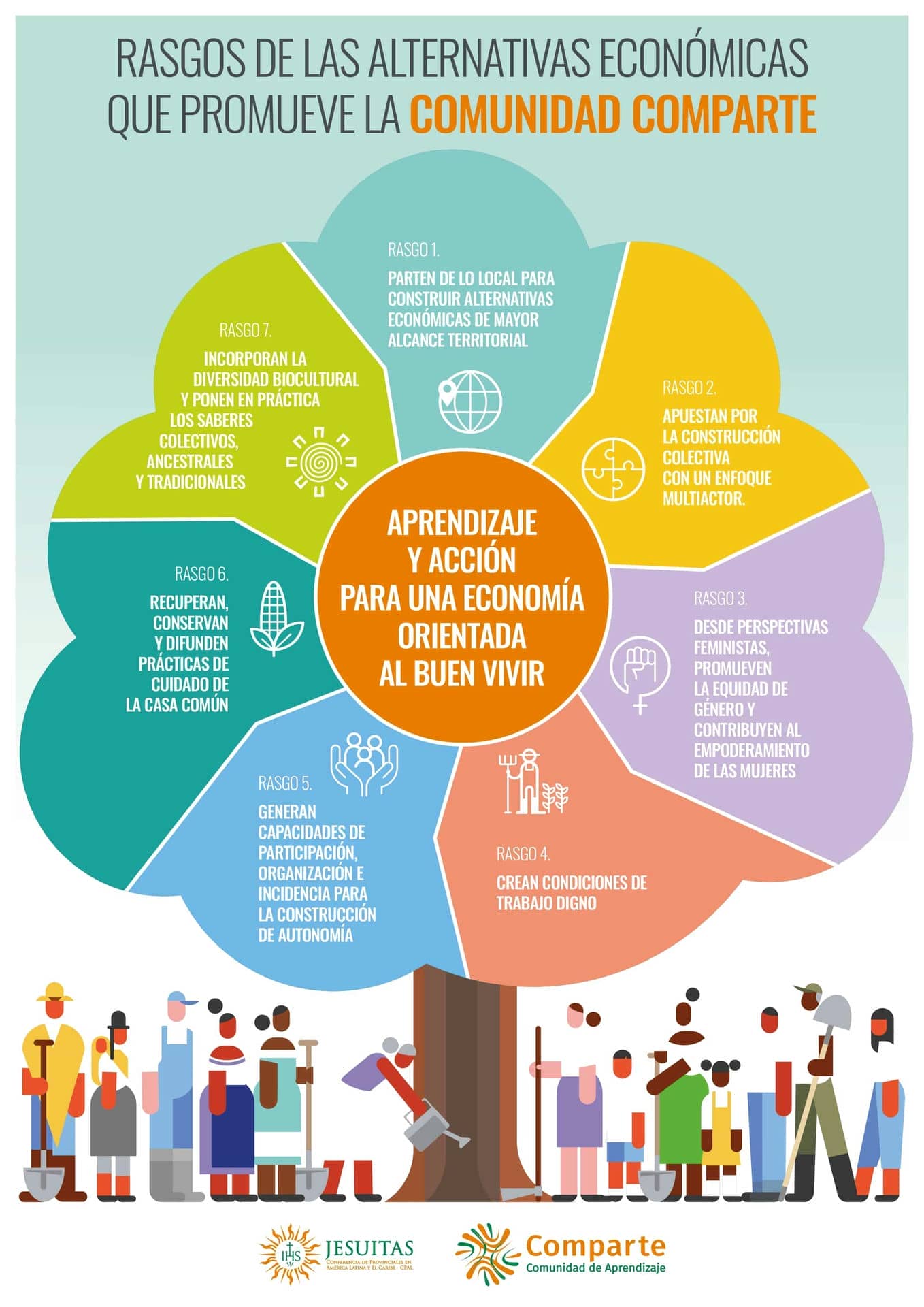 Once años después, en la Asamblea de la Comunidad celebrada en noviembre de 2021, se decidió poner en marcha un proceso de actualización de estos rasgos para incorporar los aprendizajes realizados en esta década y adecuarlos a los nuevos desafíos que tienen que afrontar las alternativas económico-productivas que acompaña Comparte. Esta actualización ha permitido, también, profundizar en la concreción de los rasgos como paso previo para abordar la definición de un sistema de auditoría interna y rendición de cuentas propio de la red Comparte (Sistema de Auditoría Socio Ambiental - SASA).