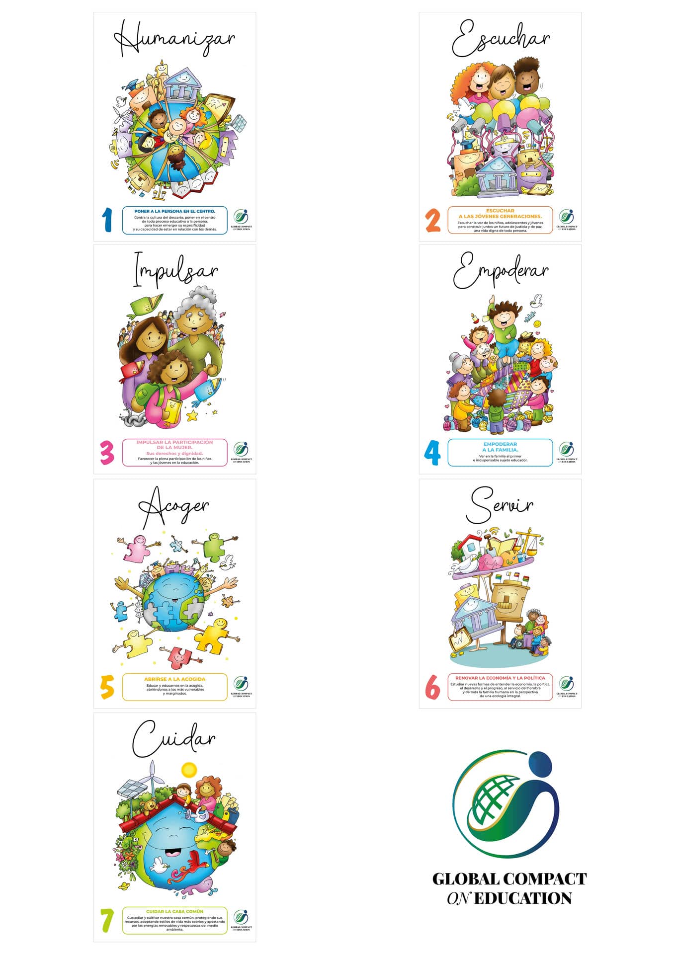 Se incluyen 7 afiches que presentan cada uno de los objetivos del Pacto Educativo Global: