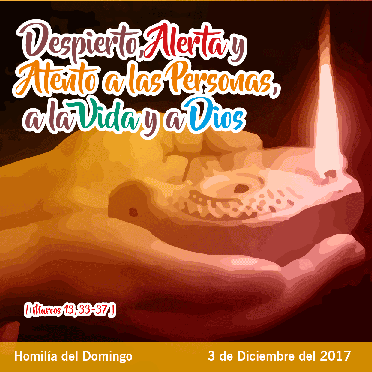 El Evangelio de Marcos (Mc. 13, 33-37) nos dice que Dios vendrá. Y vendrá a su casa que es el mundo como lo hace aquel dueño que se fue de viaje y encomendó a sus trabajadores el cuidado de lo que es suyo. Pero, como no sabemos el día ni la hora, porque Dios no se deja atrapar ni controlar, necesitamos estar alertas, atentos y despiertos.