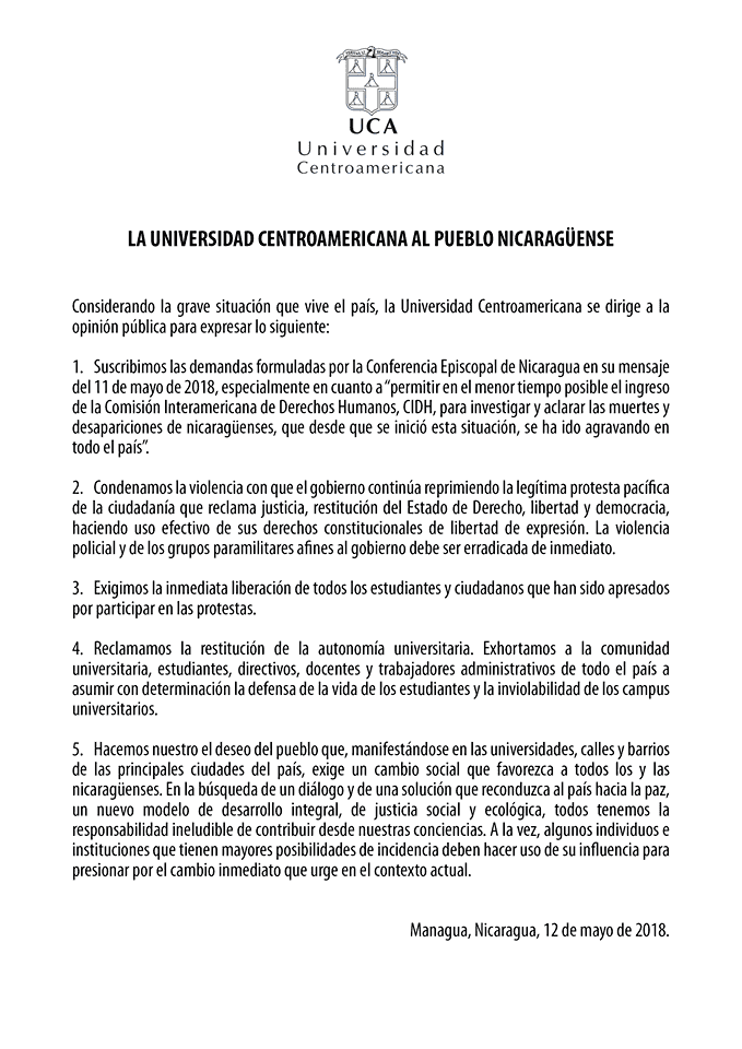 Comunicado: La Universidad Centroamericana al pueblo Nicaragüense
