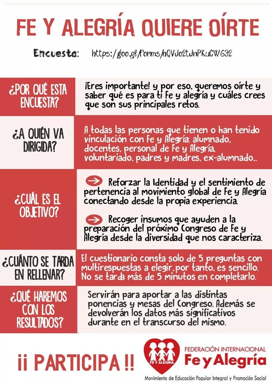 Esta encuesta tiene por nombre “Fe y Alegría quiere oírte” y pretenden llegar a más de 15.000 personas para conocer: qué piensa la gente de Fe y Alegría, cuáles es el rol que crees que deben jugar hoy en el mundo, cuáles son sus principales retos de futuro.