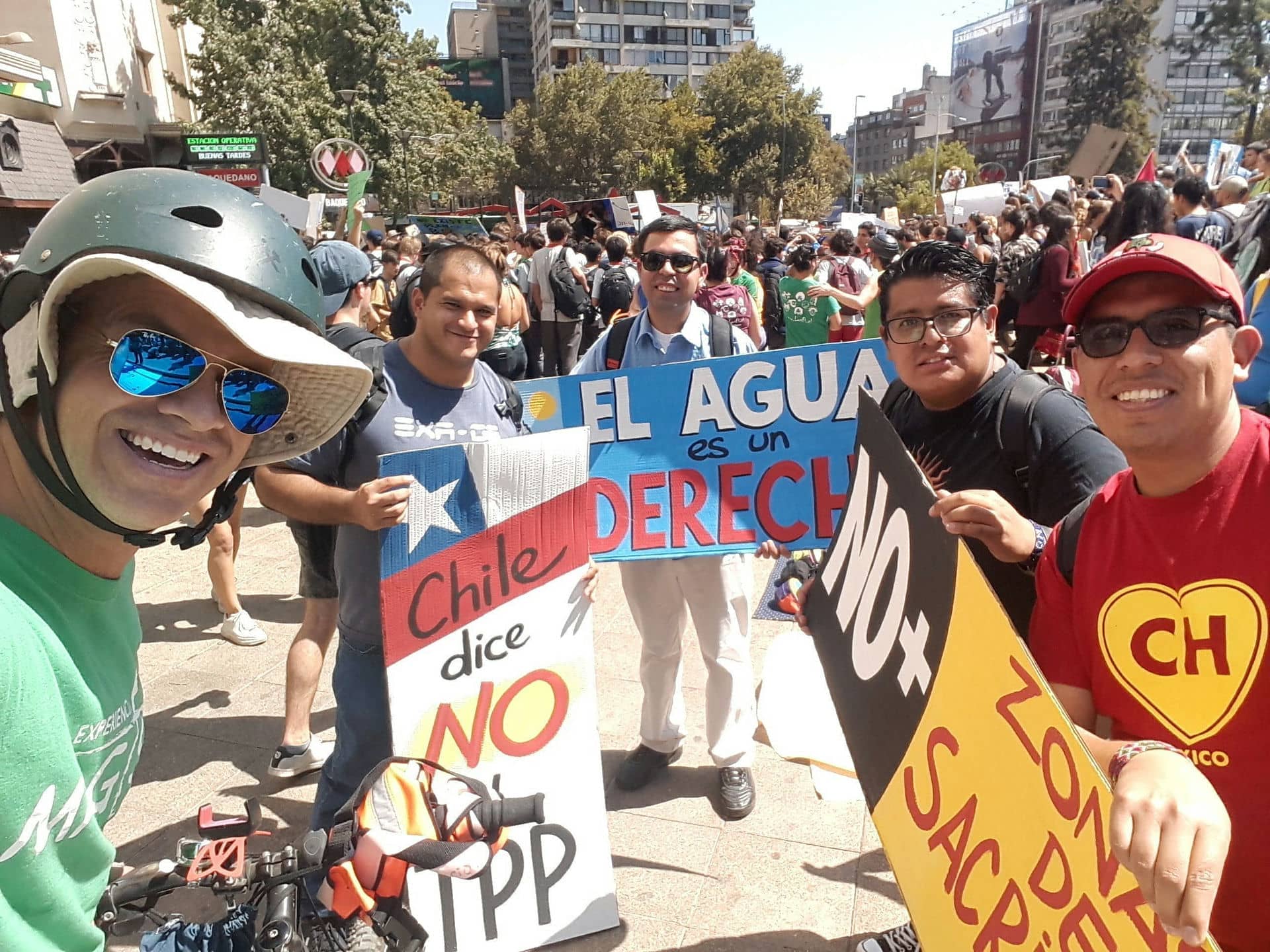 “No más zonas de sacrificio”, “El cambio climático es inminente”, “Ni un grado más, ni una especie menos”, “Scouts unidos por un mundo mejor”, “Salvaje no es quien vive en la naturaleza, salvaje es quien la destruye”, “Muerto el último árbol, muerto el humano”, “GO Vegan” = “Hazte vegano”[1], “Si la civilización quiere sobrevivir, debe vivir del interés de la Naturaleza, no del capital”, “¿Para qué estudiar para un futuro que no va a existir?”, “El cambio está en tus manos, el cambio está en tus pies, el cambio es para ahora y no para después”, “No TPP, puedes engañar a los votantes pero no al planeta”, son algunas de las frases de los carteles y pancartas que portan los jóvenes. Me llama la atención ver estudiantes con uniforme de colegio, son miles de menores de edad. Su presencia y compromiso me alegra y me llena de esperanza. Estimo que el 80 por ciento de los que marchamos hoy son personas jóvenes entre 15 y 35 años. El 20% restante somos mayores de 35. Espero que estos jóvenes que hoy marchan no dejen de luchar por una sociedad que cuide mejor que mi generación al planeta y sus recursos naturales.