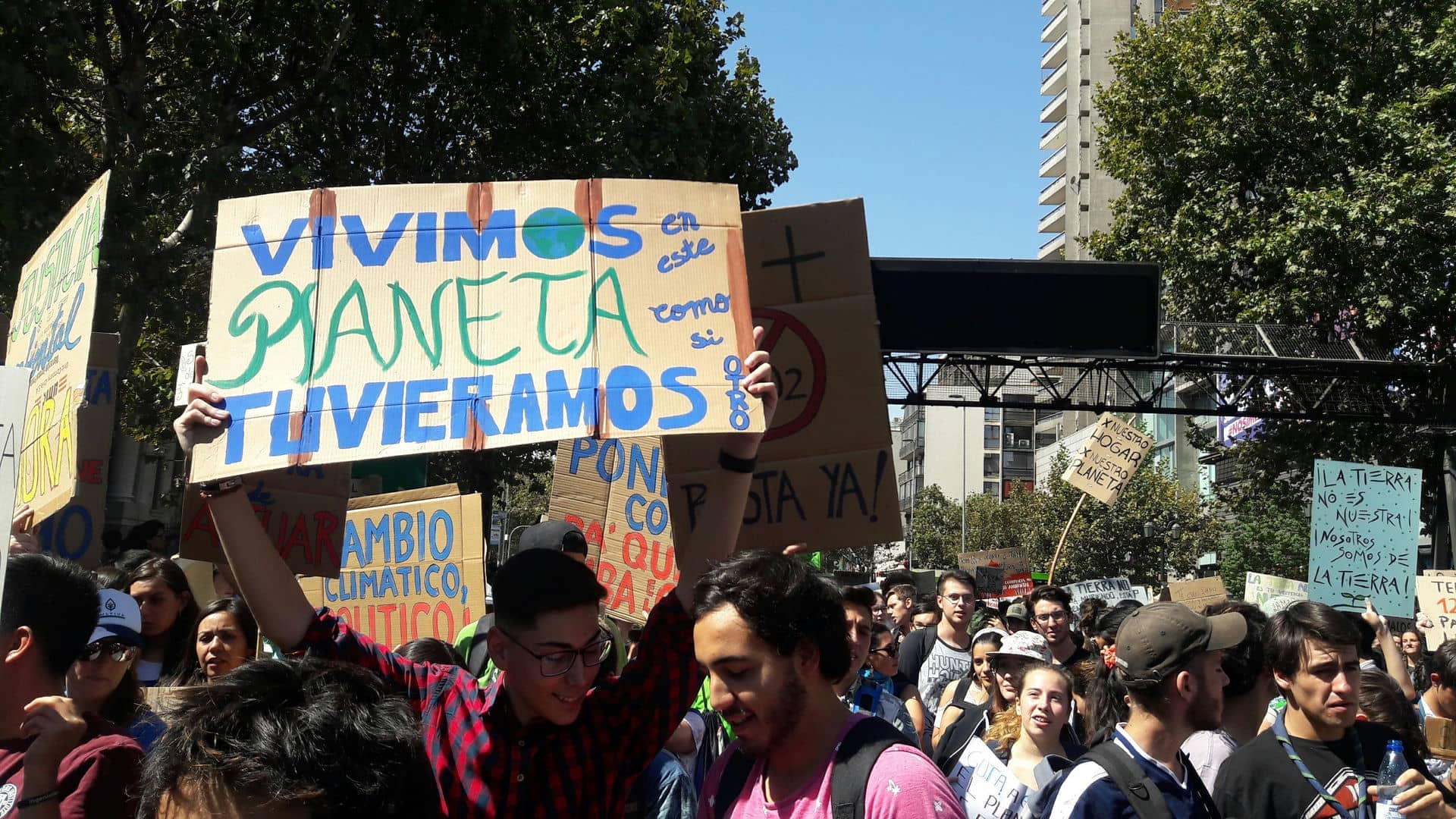 “Hola, soy Martín, tengo 21 años y cuando cumpla 28 habrá tres veces más plástico en el océano”, “Soy Cami, Torres, tengo 20, y cuando tenga 28 habrán desparecido un cuarto de todas las tierras cultivables del mundo”, “Hola, soy Iván, y para cuando tenga 58 el mar inundará tierras equivalentes al área de Chile”, “Cuando decidas venir a la marcha en el 2020 ya habrán muerto 150,000 nuevas personas por el cambio climático”, decían los carteles que portaban varios universitarios – con los ojos vendados - en la entrada del campus San Joaquín de la Universidad Católica de Chile, para incentivar la participación en la marcha por el cambio climático y el medio ambiente.