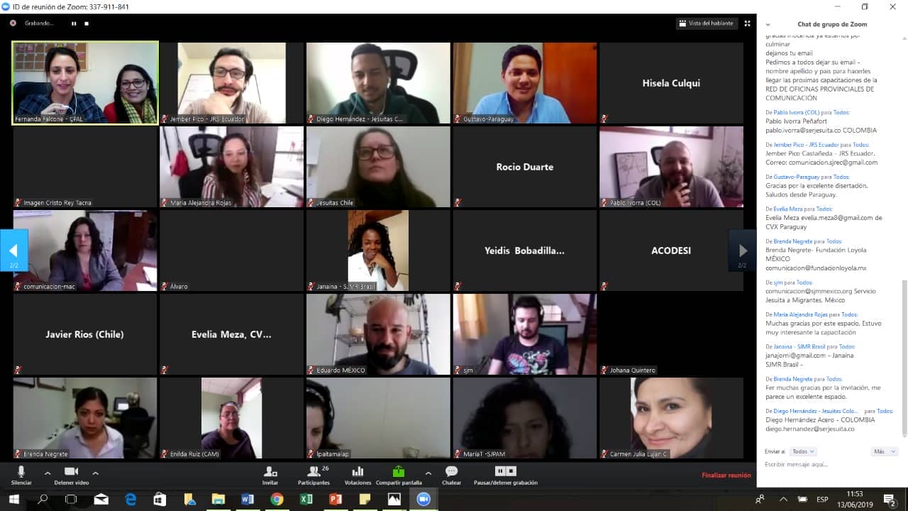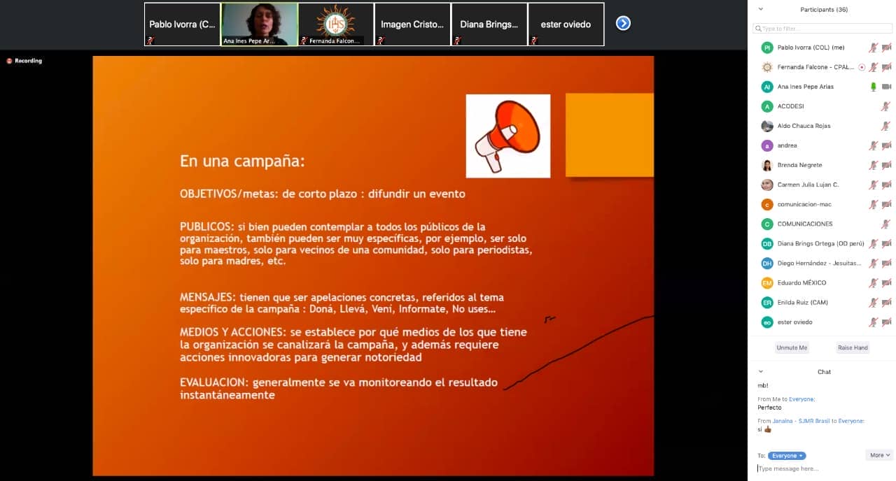 “Excelente a nivel de conocimiento, la expositora se dió a explicar muy bien. Me alegra la apertura para que los comunicadores de las otras obras se sumaran, de esta forma nuestra red se va dando a conocer y se construye/comparte conocimiento.” Enilda Ruiz – Oficina de Comunicación Provincia de Centroamerica.