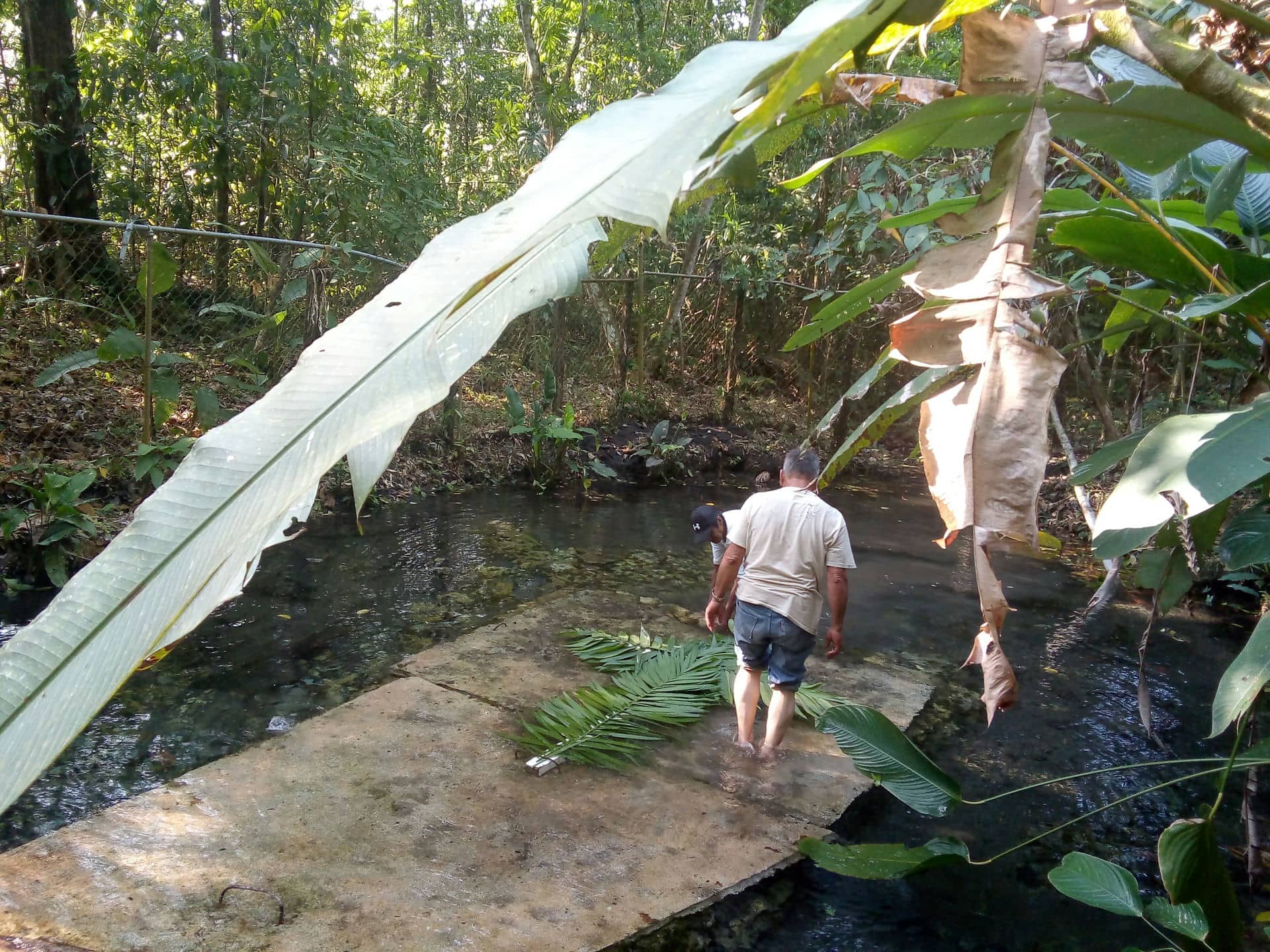 Dos catequistas llevaron la cruz, la que utiliza la comunidad para los viacrucis que hacen durante el año, al manantial y la sumergieron bajo el agua. Allí se quedará todo el tiempo que dure la fiesta. Cada año la traen para agradecer al cuidador del agua y pedirle la lluvia.