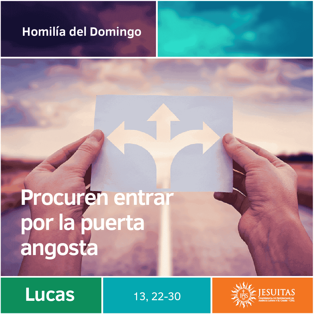 Nos viene muy bien recordar esta poesía de Benjamín González Buelta, S.J., cuando la liturgia nos propone el texto evangélico de Lucas en el que Jesús le recomienda a sus discípulos: “Procuren entrar por la puerta angosta; porque les digo que muchos querrán entrar y no podrán”. Es muy fácil que nos sintamos atraídos por las puertas y los caminos anchos que nos ofrece la sociedad de consumo. Es muy fácil que nos olvidemos que el callejón que lleva a la vida es estrecho y supone sacrificios. Cada quién tiene que revisar su vida y reconocer por dónde pasan estos caminos estrechos del seguimiento del Señor en nuestra propia historia.