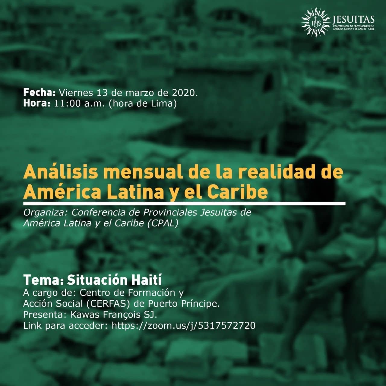 La primera cita será el próximo 13 de marzo a las 11:00 hs de Lima, y tendrá por tema principal el análisis actual de Haití. La presentación estará a cargo de Kawas François S.J. del Centro de Formación y Acción Social (CERFAS) de Puerto Príncipe (Haití).