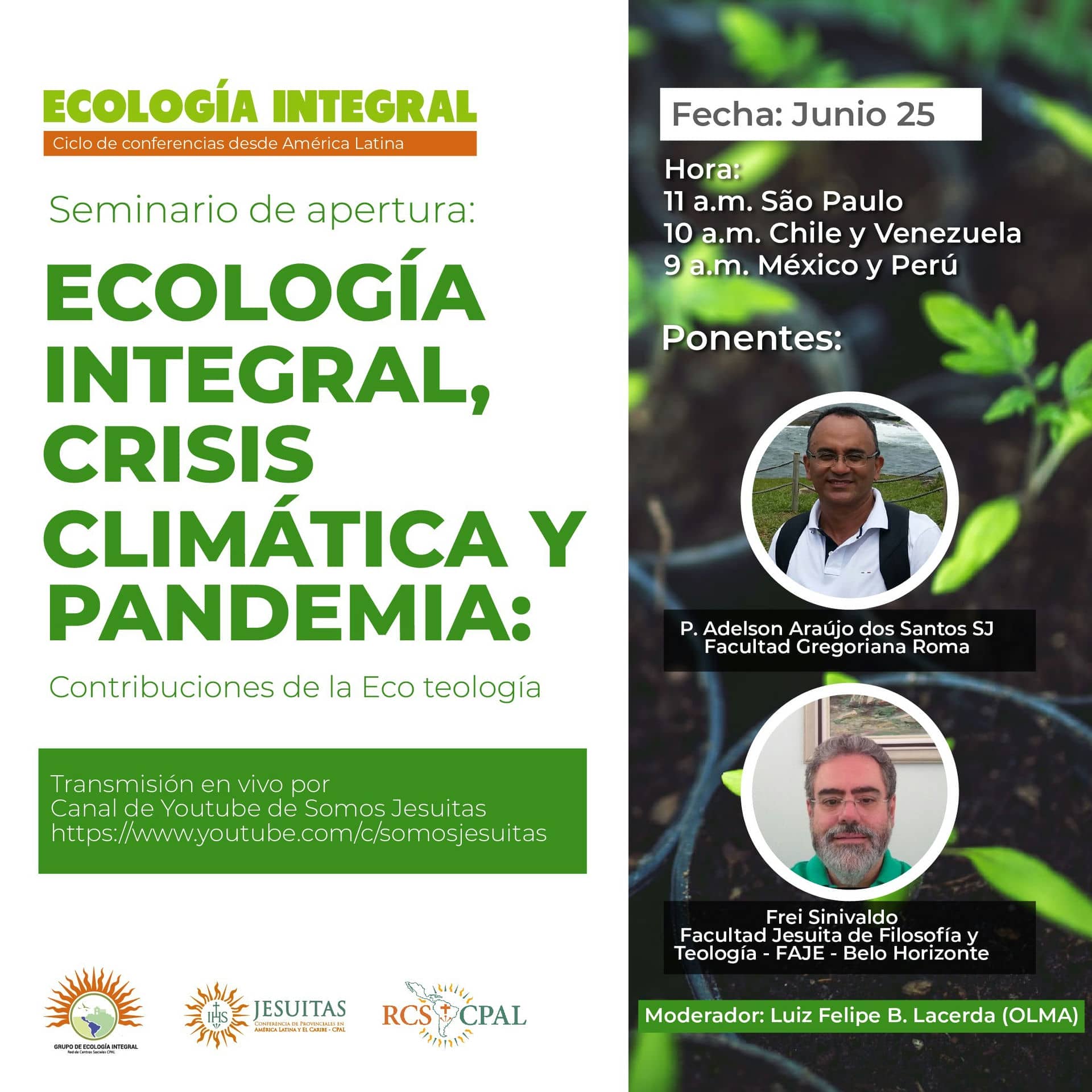 La primera conferencia virtual está pautada para el próximo 25 de junio y tendrá por nombre "Ecología integral, crisis climática y pandemia: Contribuciones de la Eco Teología", a cargo del P. Andelson Araújo dos Santos, SJ y Frei Sinivaldo. La hora fijada para este encuentro es 9:00 a.m. (hora de México y Lima).