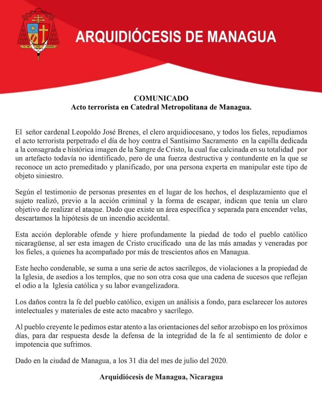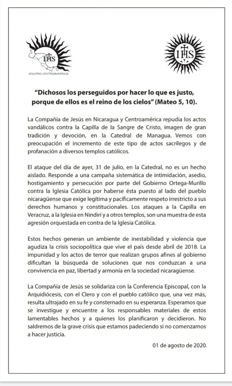 Compartimos el Comunicado de la Provincia Jesuita en Centroamérica y de la Arquidiócesis de Managua en repudio a los actos vandálicos contra la Capilla de la Sangre de Cristo el pasado 31 de julio.