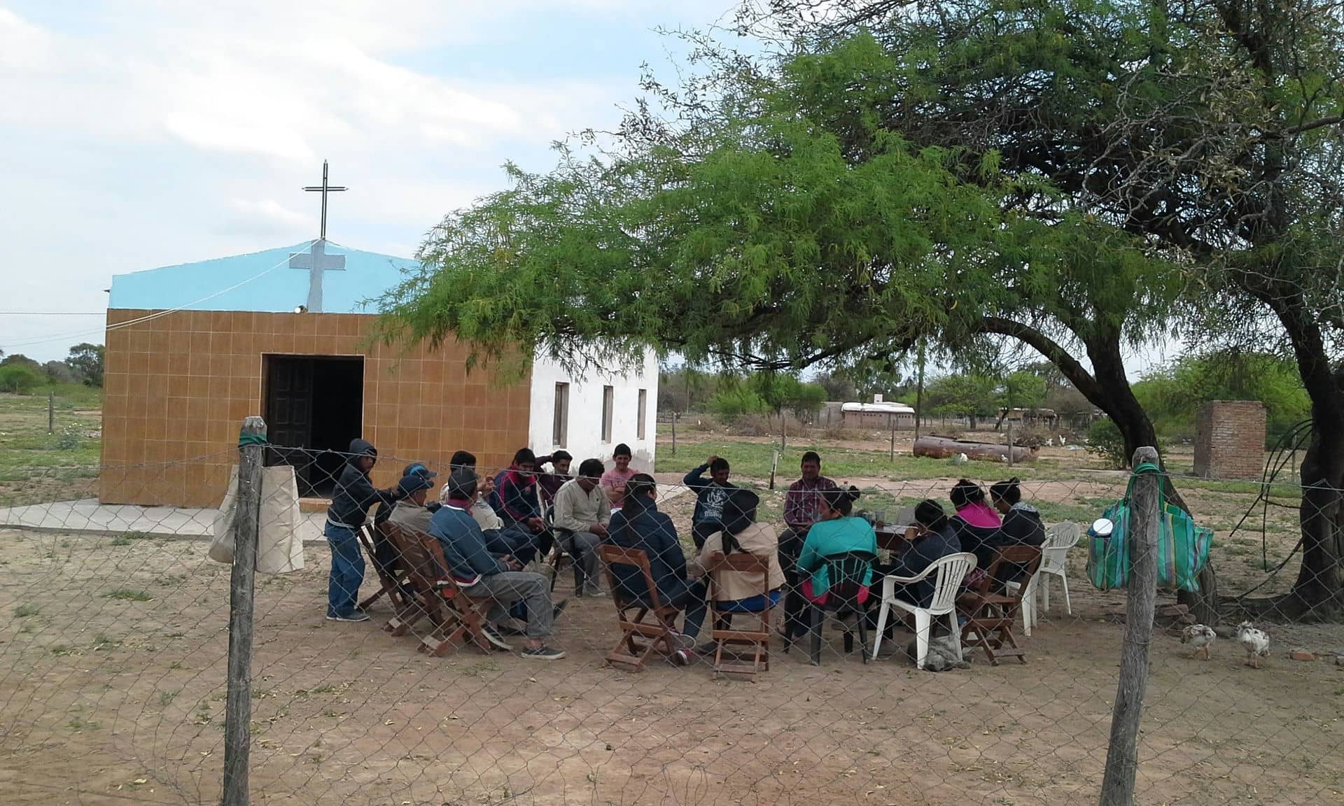 Asamblea comunitaria por conflicto en Escuela de la Comunidad Nuevo Simbolar (Etnia Lule-Vilela), parroquia San José de las Petacas, Boquerón, Santiago del Estero, norte de Argentina, Parque Chaqueño americano.