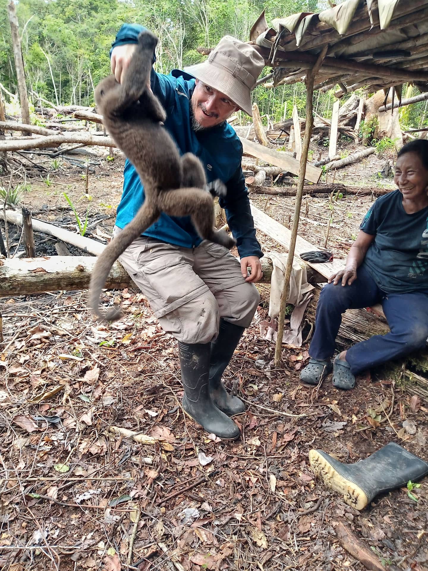 Mico llamado Maiki, Hermano Rodrigo sj y Doña Eufrasia (Etnia Huitoto). En chagra de la familia Pijachi, Km 22, trapecio amazónico, Leticia, Colombia.