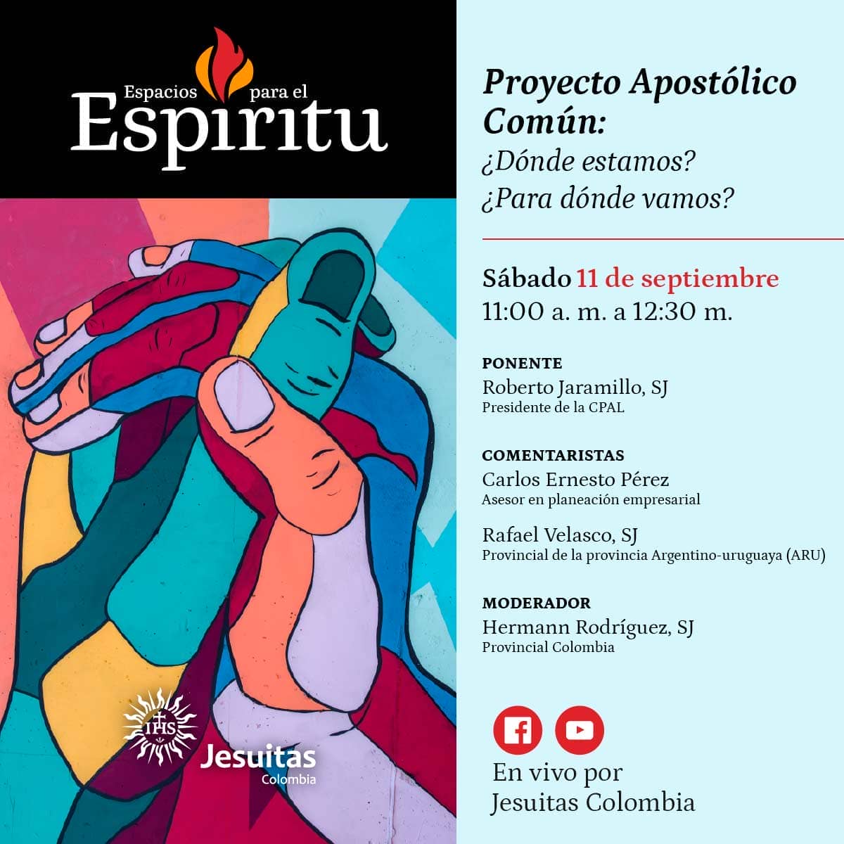 Espacios para el Espíritu se transmitirá a las 11:00 h (Colombia) a través de las redes sociales: Facebook Jesuitas Colombia y Youtube Jesuitas Colombia.