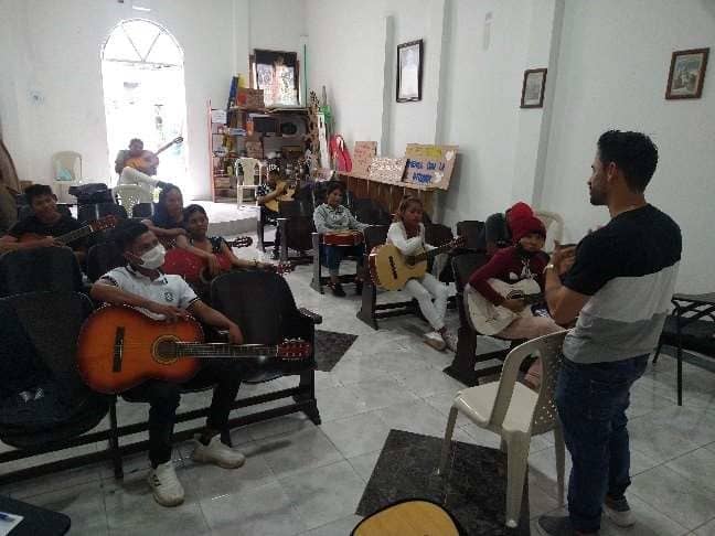 Desde el 3 de septiembre estamos realizando algunas clases de música con 15 jóvenes indígenas de la Parroquia de Nazaret. Estas clases son ministradas por Fabián Villegas, músico que colabora en la Catedral de Leticia, y tienen lugar en las dependencias de la propia catedral. La propuesta de estas clases, además de enseñar la práctica de la guitarra a estos jóvenes, es para que ellos animen y dinamicen las celebraciones en las comunidades de la Parroquia. Soñamos que estos jóvenes, a través de la música, puedan colaborar en el fortalecimiento de la fe y en las animaciones de las celebraciones y actividades de sus comunidades. Con recursos de la Fundación Entreculturas, conseguimos comprar las guitarras, garantizar transporte y alimentación, así como pagar al profesor que ministra esas clases.