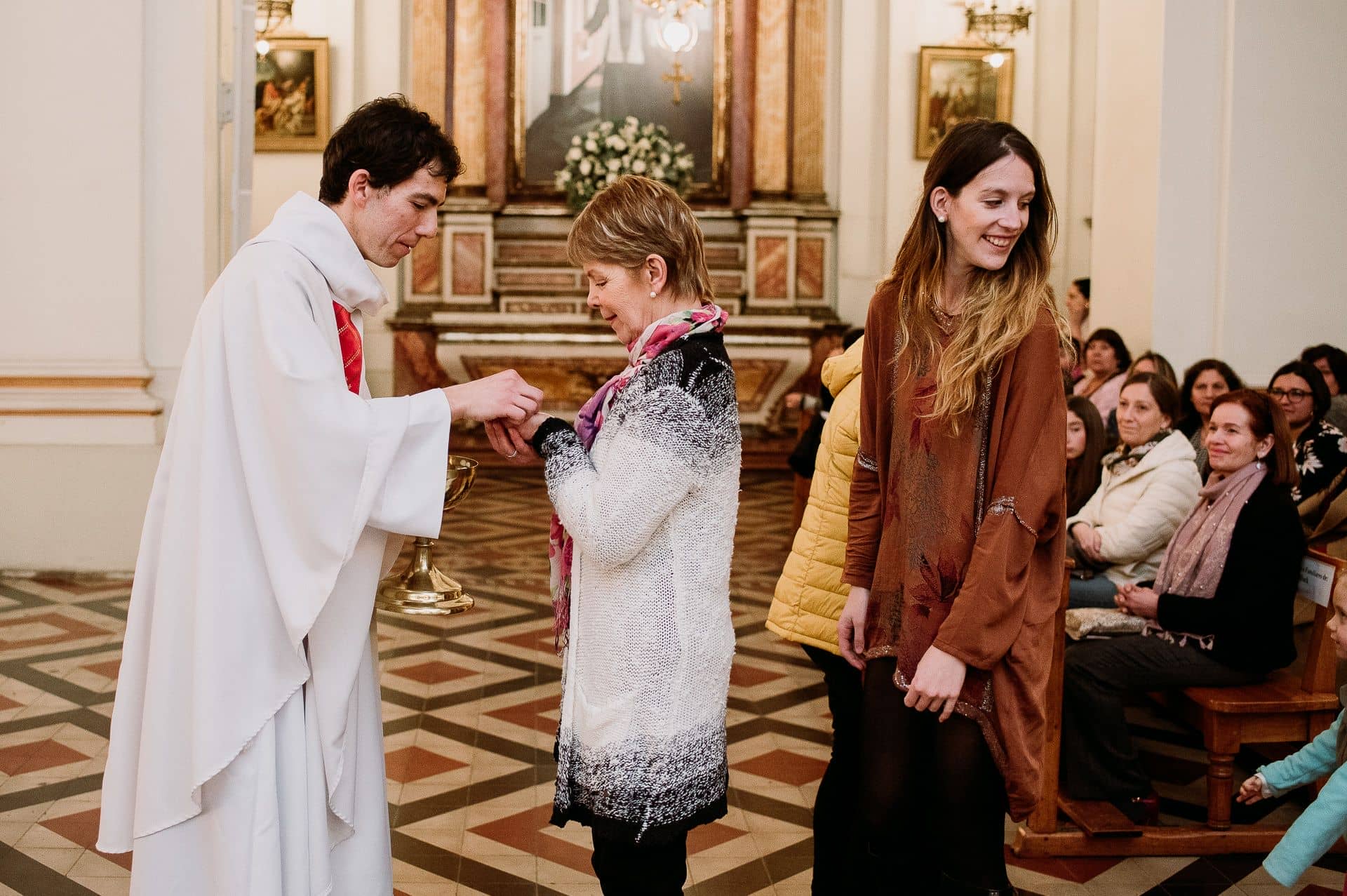 En su Ordenación Sacerdotal dándole la comunión a su mamá y su hermana.
