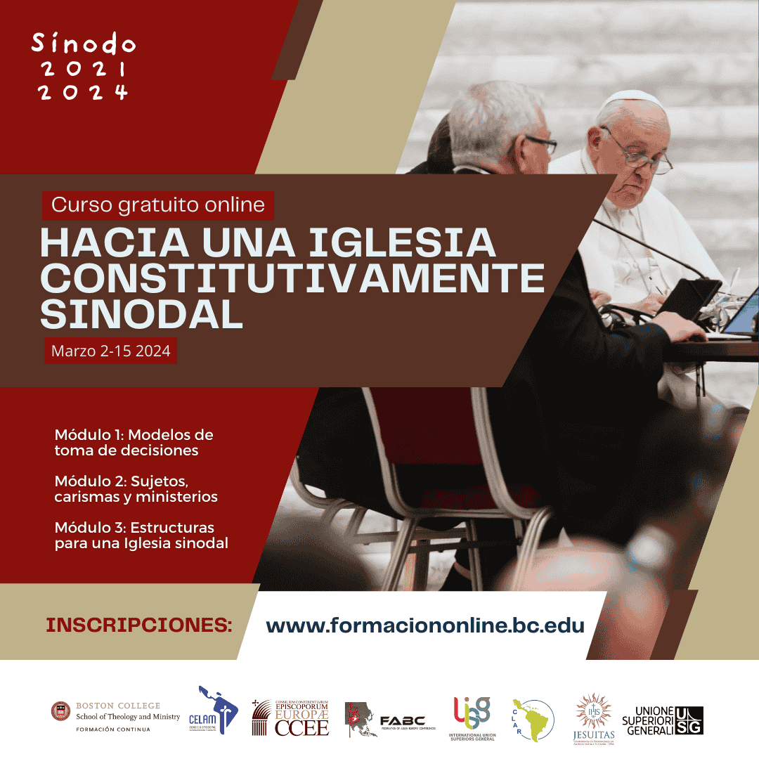 Se invita a participar del Tercer Curso Masivo Intercontinental en Línea (MOOC). Esta vez bajo el tema Hacia una Iglesia Constitutivamente Sinodal. Todos los vídeos se ofrecerán virtualmente sin coste alguno a los participantes de todo el mundo durante el mes de marzo de 2024. Utilizamos un formato asíncrono totalmente en línea. Las conferencias están pregrabadas y disponibles, en cualquier momento durante el mes de marzo, en español, inglés, portugués, francés, italiano, polaco y alemán.