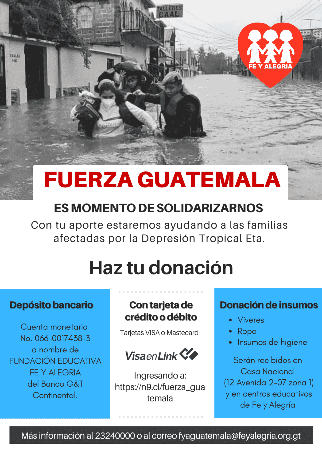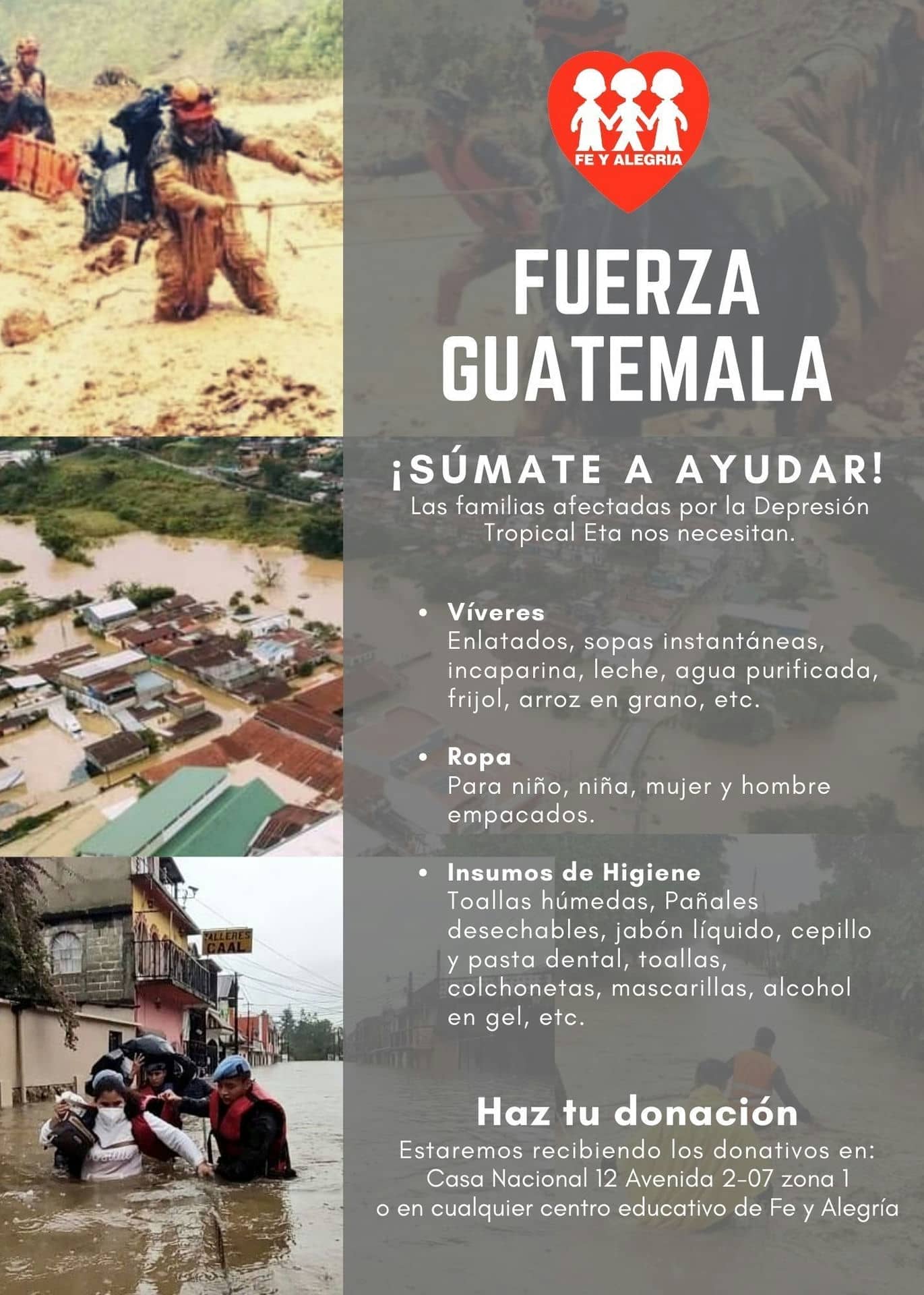 Fe y Alegría ha tomado acción para solidarizarse con sus hermanos y hermanas guatemaltecas recolectando víveres, ropa e insumos y poniendo a su disposición los centros educativos como centro de acopio y albergues para facilitar el apoyo a los damnificados por el huracán Eta.