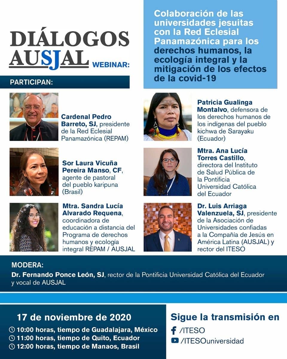 Como parte de las actividades para celebrar el 35 aniversario de la Asociación de Universidades Confiadas a la Compañía de Jesús en América Latina (AUSJAL), nos invitan, a todo el Cuerpo Apostólico de la CPAL a participar en el próximo webinar: “Colaboración de las universidades jesuitas con la Red Eclesial Panamazónica para los derechos humanos, la ecología integral y la mitigación de los efectos del COVID-19”.