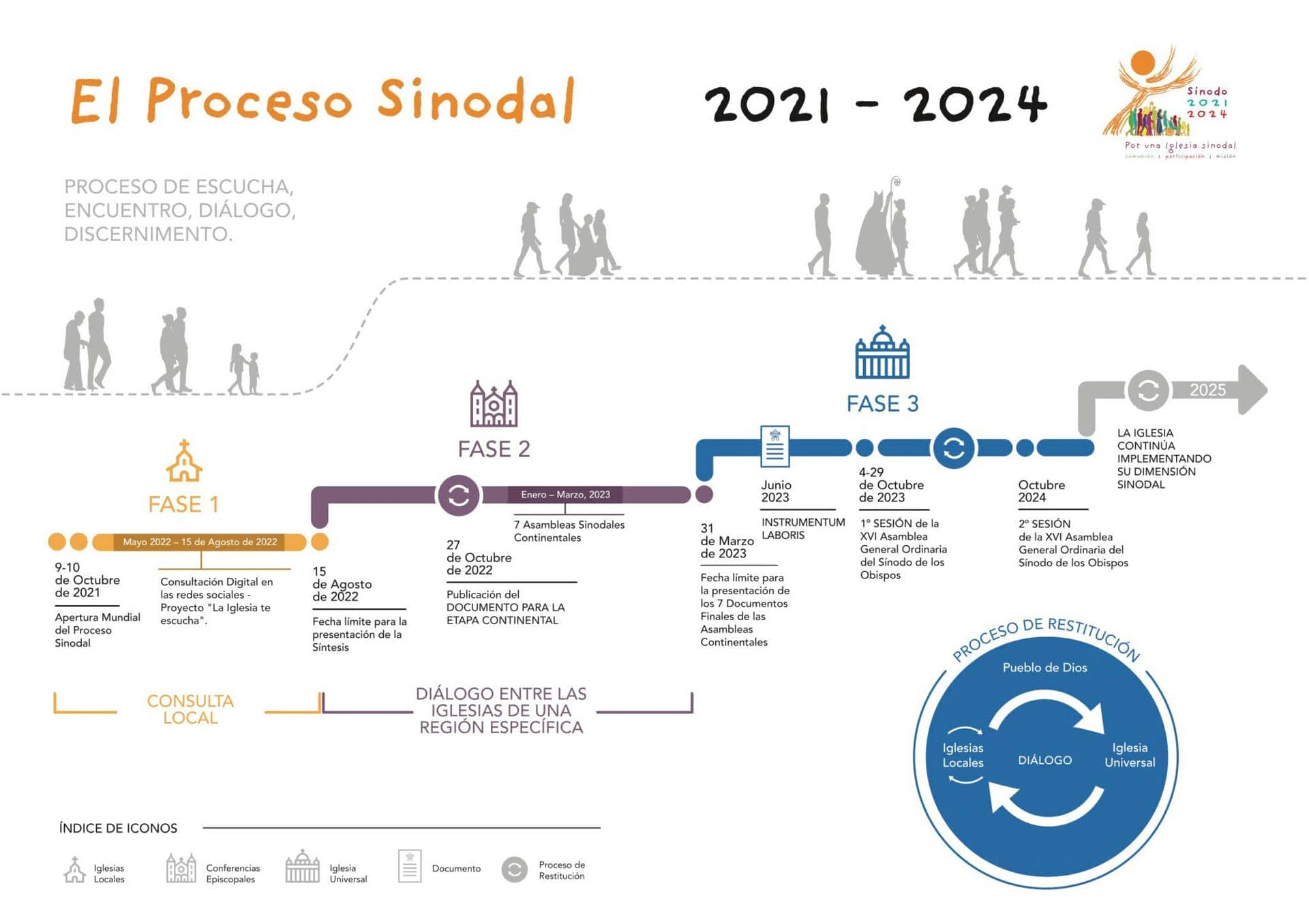 - Fase diocesana (octubre 2021 - abril 2022). Fase de consulta al Pueblo de Dios con la finalidad de que el proceso sinodal se realice en la escucha de la totalidad de los bautizados. Posterior a la fase diocesana, cada diócesis envía sus contribuciones a la Conferencia Episcopal.